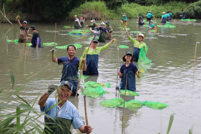 嘉義分署今年5月25日辦理志工活動,邀集生物多樣性研究所、農田水利署嘉南管理處等政府單位夥伴,以及嘉義縣野鳥學會、塗溝社區發展協會、國家森林志工、官田水雉生態教育園區志工、美濃湖水雉復育工作站志工、荒野保護協會嘉義分會與國立嘉義大學學生等50人,於九芎埤種下2萬株的印度莕菜及菱角復育水雉棲地。