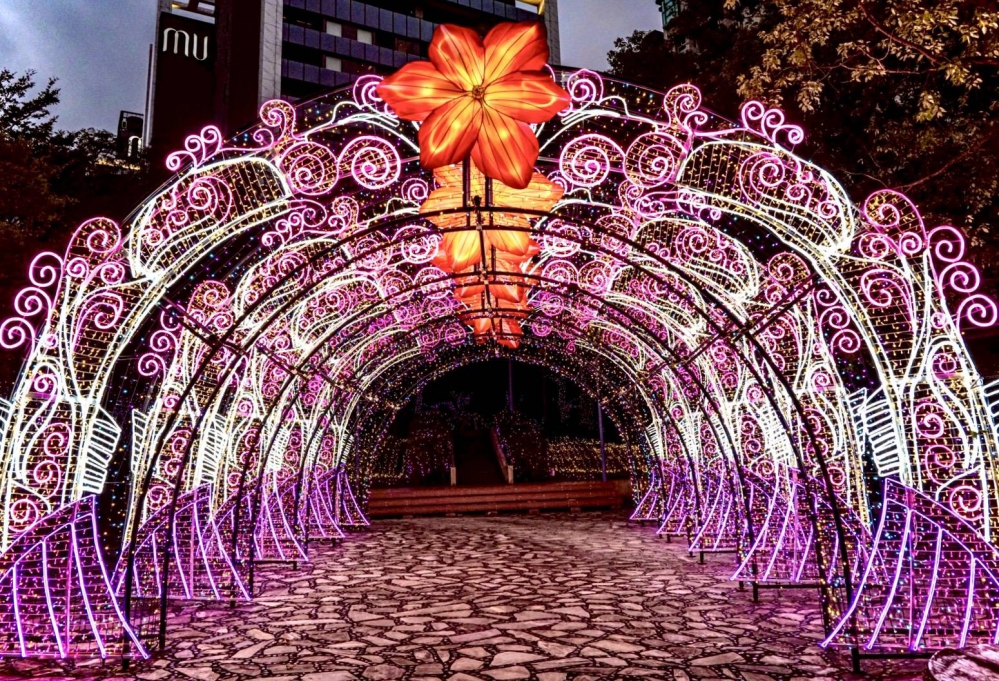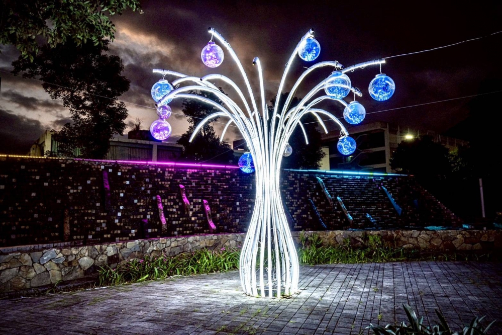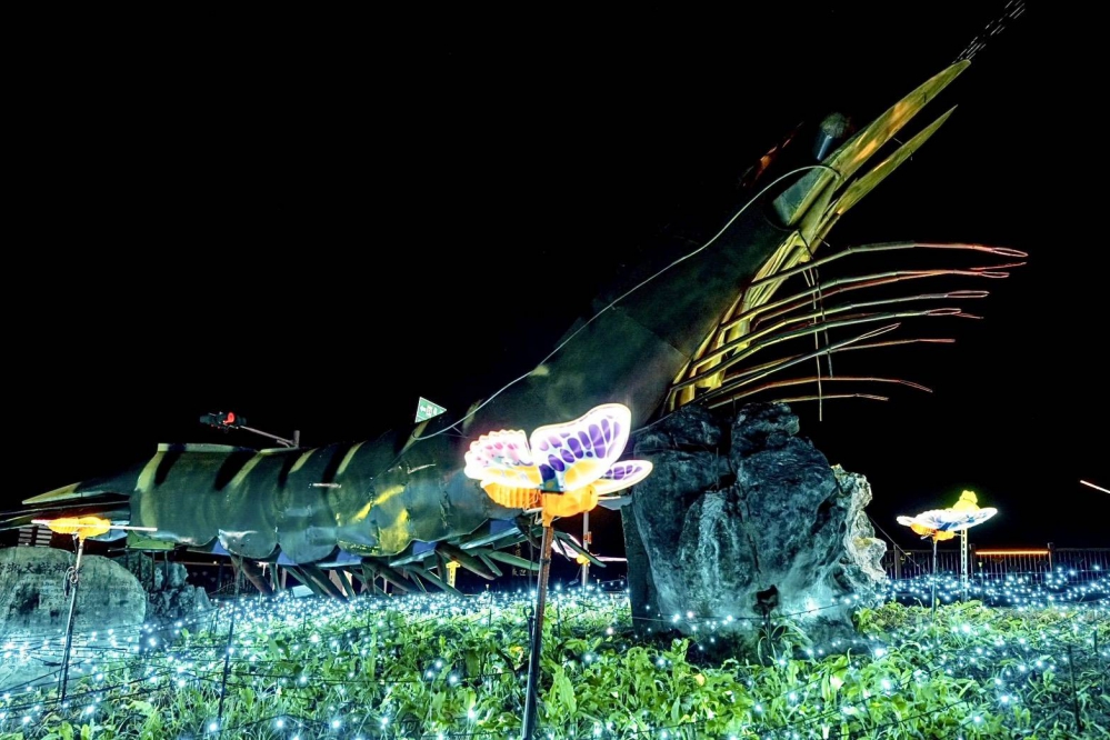 主燈座椅休憩區以溫泉湯為靈感,搭配水藍燈景與溫泉魚造型花燈,營造生命力與藝術氣息;主燈步道區以永續自然概念設計,運用樹枝燈片構築出交錯的光影廊道,彷彿自然的脈絡在夜色中流動,讓人流連忘返。