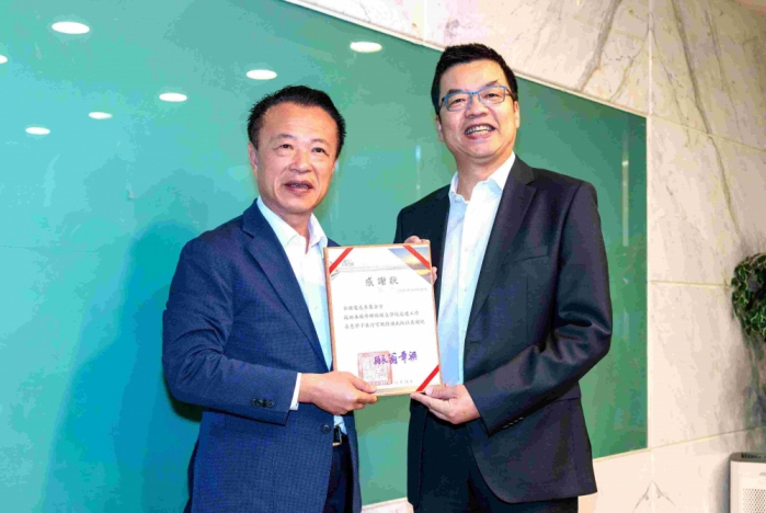 台積電先進封裝技術服務組織副總經理何軍及慈善基金會執行長彭冠宇等團隊成員,今天(28日)拜會縣長翁章梁,翁縣長代表嘉義縣致贈感謝狀。