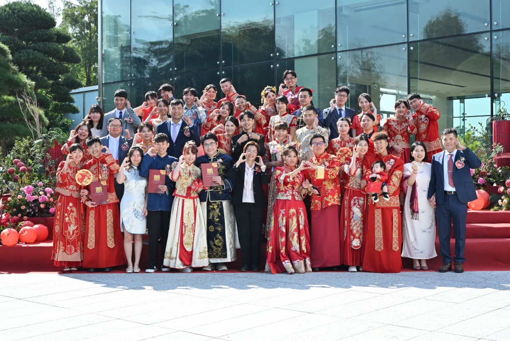 〔記者林碧珠永靖報導〕2025年彰化縣集團結婚,今(29)日在永靖鄉成美文化園區舉行,婚禮採中式古禮,由縣長王惠美給42對新人證婚,來賓和親友祝新人早生貴子,王縣長說,縣府推出甚多政策,讓年輕朋友「安心生、放心養,幸福滿又滿」。