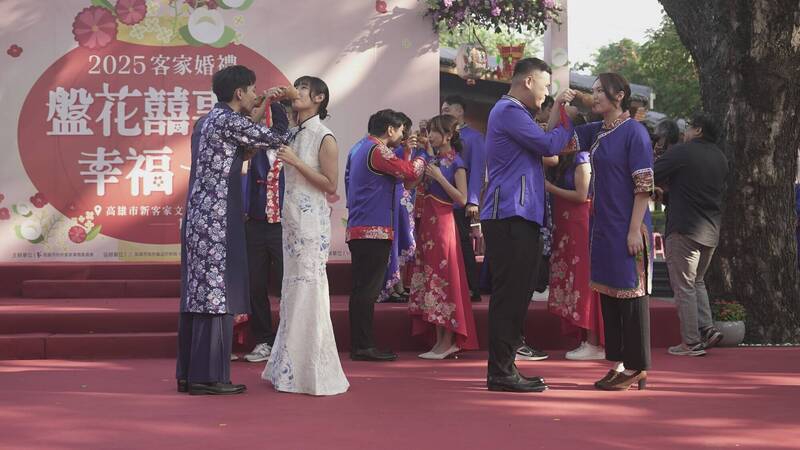 高市客家婚禮昨下午登場,高市客委會規劃八音悠揚的樂聲與象徵為新人「起家」的帶路雞,引領21對新人沿著綠蔭搖曳的雨豆樹步道緩緩進場,彩旗輕舞、光影流轉,典雅的客家禮服在自然光線中展現傳統與時尚交融的獨特韻味。