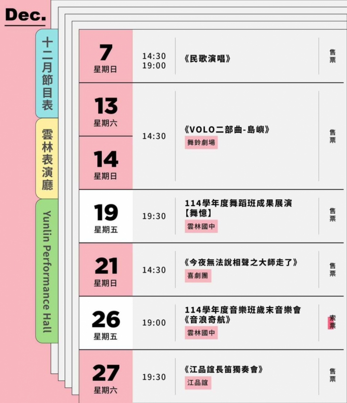 ◆詳細活動資訊可至Facebook粉絲專頁「雲林表演廳」:https://www.facebook.com/yunlinperformance/?locale=zh_TW查詢。