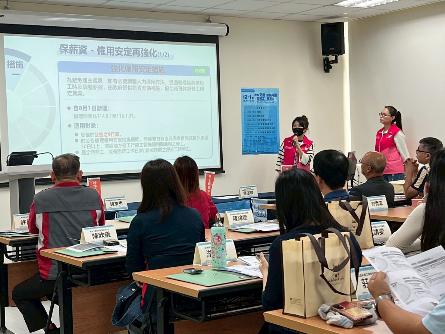 勞發署雲嘉南分署技正楊慶元表示,「支持勞工安定就業措施」是在經濟變局下穩定就業的相關補助與措施,目的在於協助企業穩定經營與保障勞工就業。主要計畫有協助勞工渡過減班休息期間的「僱用安定措施」與「充電再出發訓練津貼」,以及提供雇主「勞工就業通計畫」的僱用獎助、工作崗位訓練及職務再設計等。鼓勵企業積極運用這些資源,應變市場變動期間維持企業競爭力,並保障勞工的收入與專業成長。