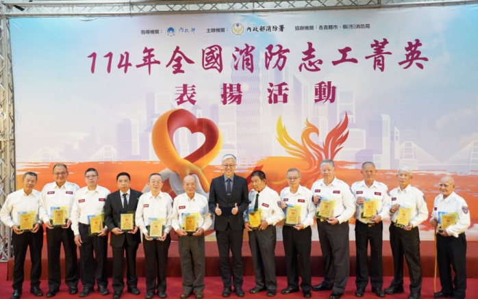 今(5)日為聯合國「國際志工日」,內政部特別舉辦「114年全國消防志工菁英頒獎表揚活動」,以表彰在災害防救、救護及防火宣導方面奉獻心力的志工。行政院長卓榮泰、內政部次長吳堂安、行政院災害防救辦公室主任王怡文及消防署署長蕭煥章等重要官員出席,為全國45名消防志工菁英以及49名服務滿40年及45年以上的資深義消頒獎,感謝他們的無私奉獻與貢獻。