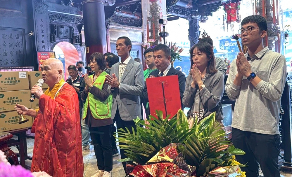 北港朝天宮董事長蔡咏鍀今天(10日)陪同南僑集團-皇家可口(股)公司高長慶副董事長、華強實業(股)公司營業部吳彥蓉經理、創世基金會李秀娟副秘書長等人登殿參拜,現場獻上超大金元寶,祈求媽祖護佑創世基金會「寒士吃飽30」活動順利。