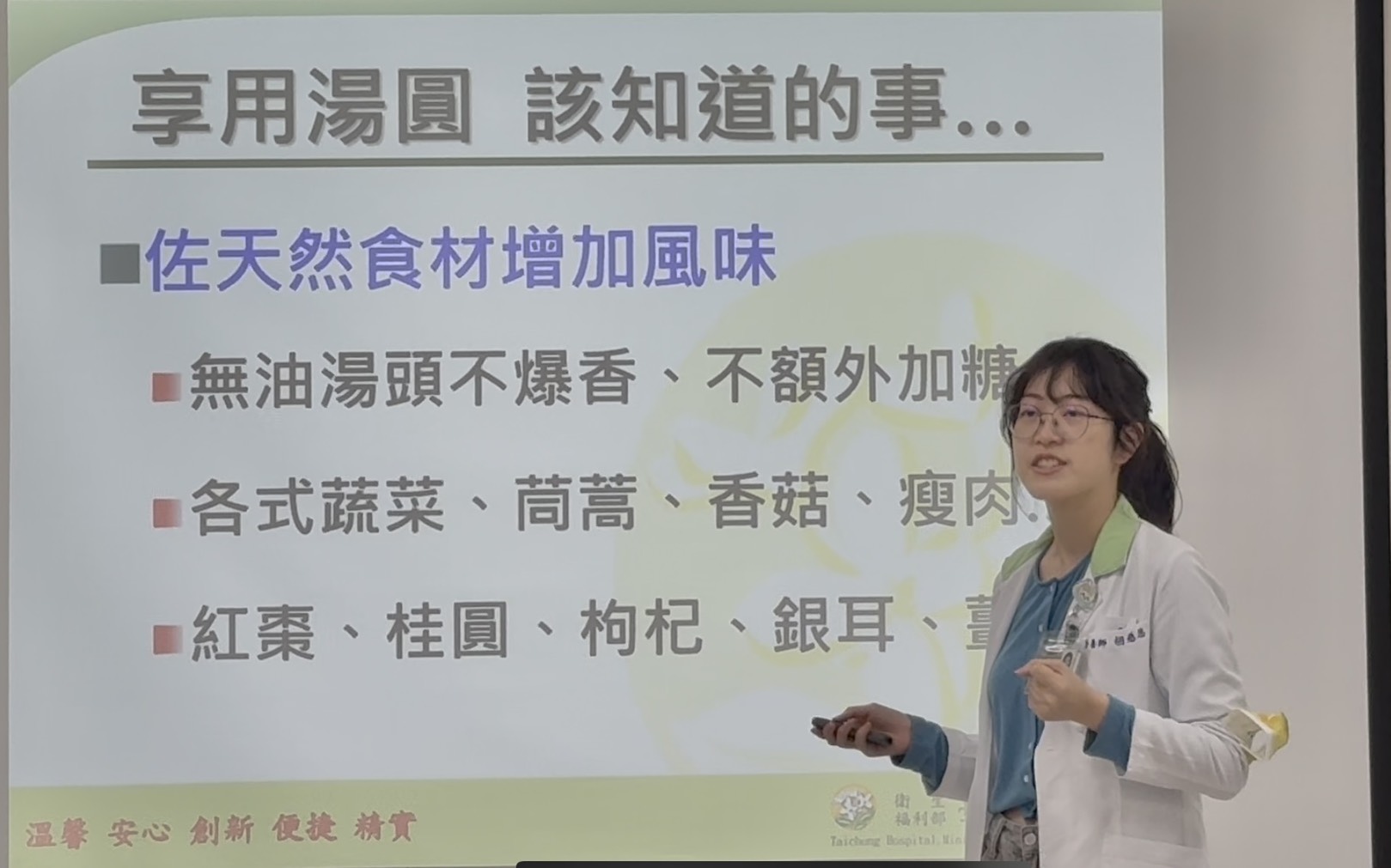 「四顆包餡湯圓的熱量,大約等於一碗飯。」臺中醫院營養室胡慈恩營養師進一步說明,甜湯圓常搭配糖水或紅豆湯,容易在不知不覺中攝取過多糖分,影響血糖控制,建議可改以無糖豆漿取代糖水,增加蛋白質攝取,讓飲食更均衡。鹹湯圓因內餡含有肉類與油脂,營養相對完整,但仍需注意湯圓數量,避免澱粉攝取過量,並可加入蔬菜一同烹煮,增加膳食纖維,讓營養更均衡。