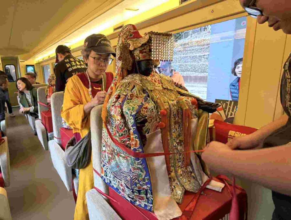 嘉義縣長翁章梁今天(19日)下午在奮起湖車站旁的祈福區,寫下歡迎媽祖駕到的祝福,會同交通部觀光署長陳玉秀、奉天宮董事長何達煌等人參拜後,隨著媽祖搭上林鐵栩悅號,民眾簇擁車旁揮手相送,形成信仰與文化交織的旅遊新名片。