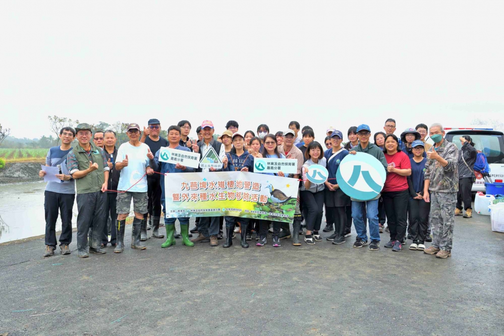 【記者張文一嘉義報導】農業部林業及自然保育署嘉義分署為復育保育類珍貴稀有水雉族群,營造適宜棲息與繁殖環境,認養位於嘉義縣水上鄉九芎埤塘,趁著九芎埤抽水曬池的低水位期間辦理外來種水生物移除活動,邀集生物多樣性研究所、嘉義縣野鳥學會、塗溝社區居民、嘉南藥理大學與國立嘉義大學師生等共計75位夥伴,下水移除外來魚種共計55公斤、446尾,期能恢復埤塘整體生態平衡,保護水雉雛鳥不受外來種威脅,讓九芎埤成為嘉義縣水雉繁殖最佳場域。