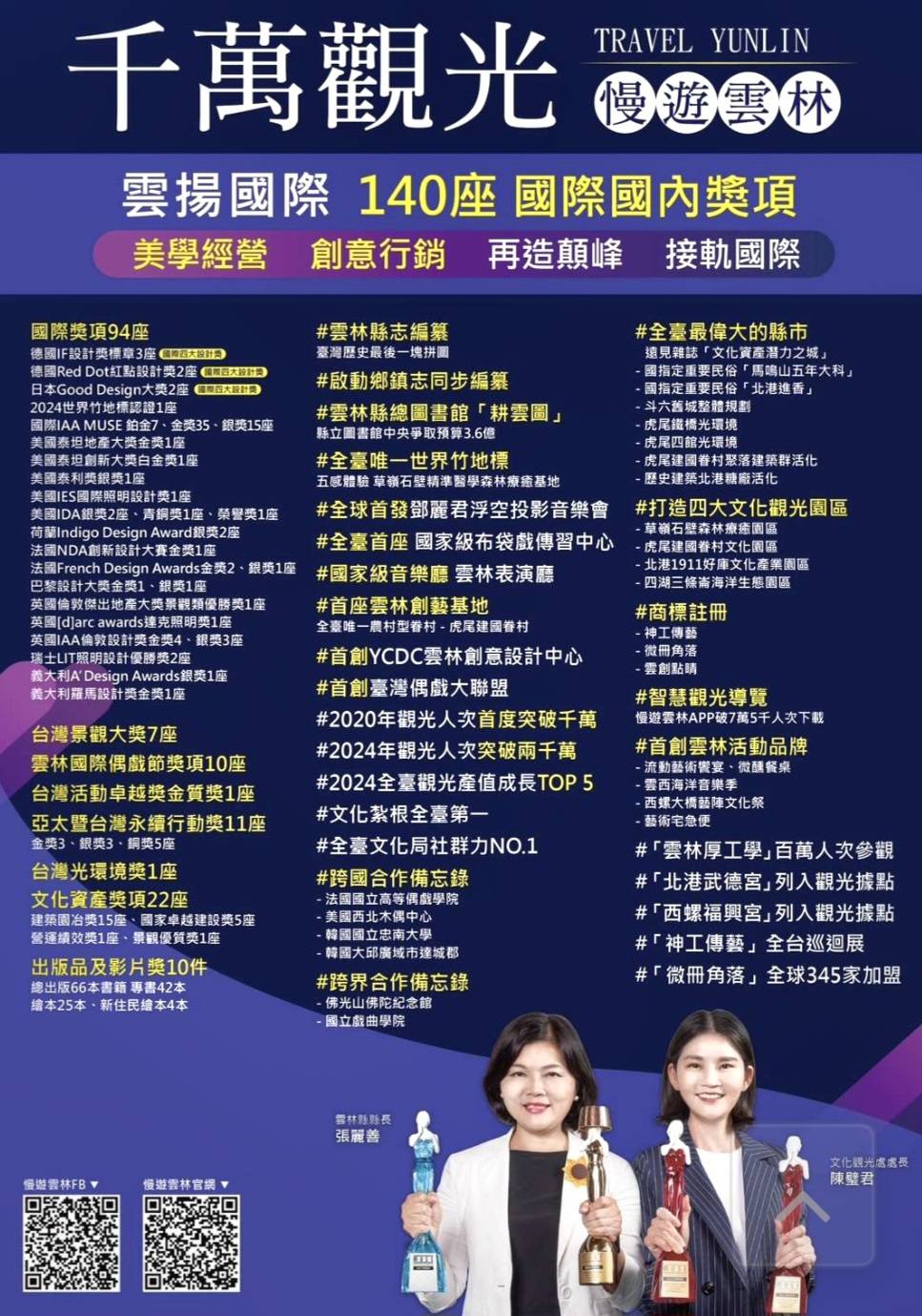 自108年獲縣長張麗善延攬返鄉出任文化觀光處處長以來,成功在5年內讓雲林觀光人次從700萬飆升到2,000萬人次,獲選第十五屆「MVP」經理人,更帶領文觀團隊奪得數十座國際獎項,成功塑造雲林文化觀光全新形象與榮景。