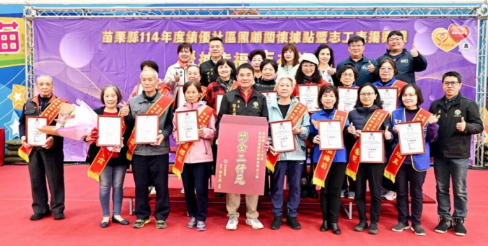 接受表揚的5個績優社區照顧關懷據點,包含通霄鎮平元社區發展協會、銅鑼鄉中平社區發展協會、竹南鎮塭內社區發展協會、竹南鎮佳興社區發展協會及西湖鄉龍洞社區發展協會,每個單位頒贈獎勵金各1萬元及獎盃各1座,以及185位社區照顧關懷據點績優志工獎,每人頒贈獎勵金各2,000元及祝賀狀。