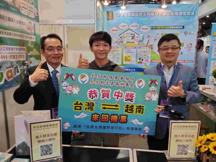 此外,辦事處於本年11月21日至24日參與於大臺南會展中心舉行之「大臺南國際旅展」,設攤宣導旅外安全注意事項及最新領務便民措施。旅展期間,外交部領事事務局鄭局長正勇亦特別南下出席,並與曾榮傑處長共同主持「出國機票快閃抽獎」活動,現場氣氛熱絡。四天展期共吸引逾3,000名民眾至攤位參觀互動,成效顯著。