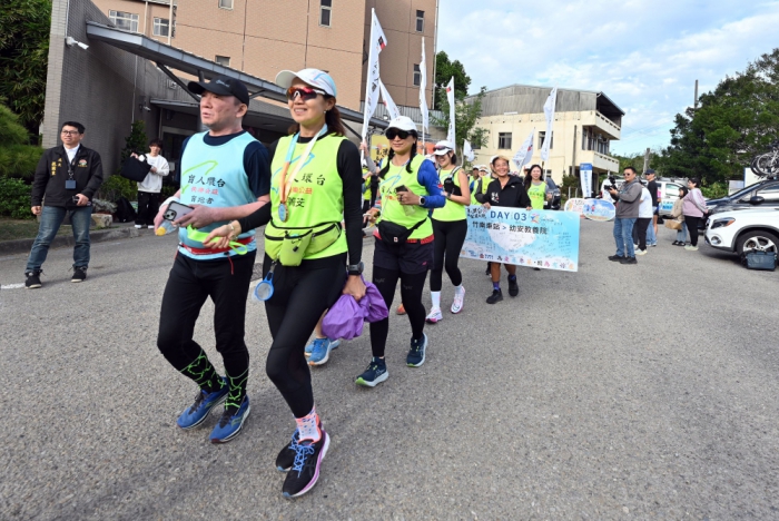 「盲人環台為公益而跑」活動今天上午抵達苗栗縣竹南火車站,下午接續到苗栗市幼安教養院稍作休息,院生們特地準備表演歡迎,院方也準備炒米粉和糕點給視障成員和陪跑者補充體力,相當貼心。