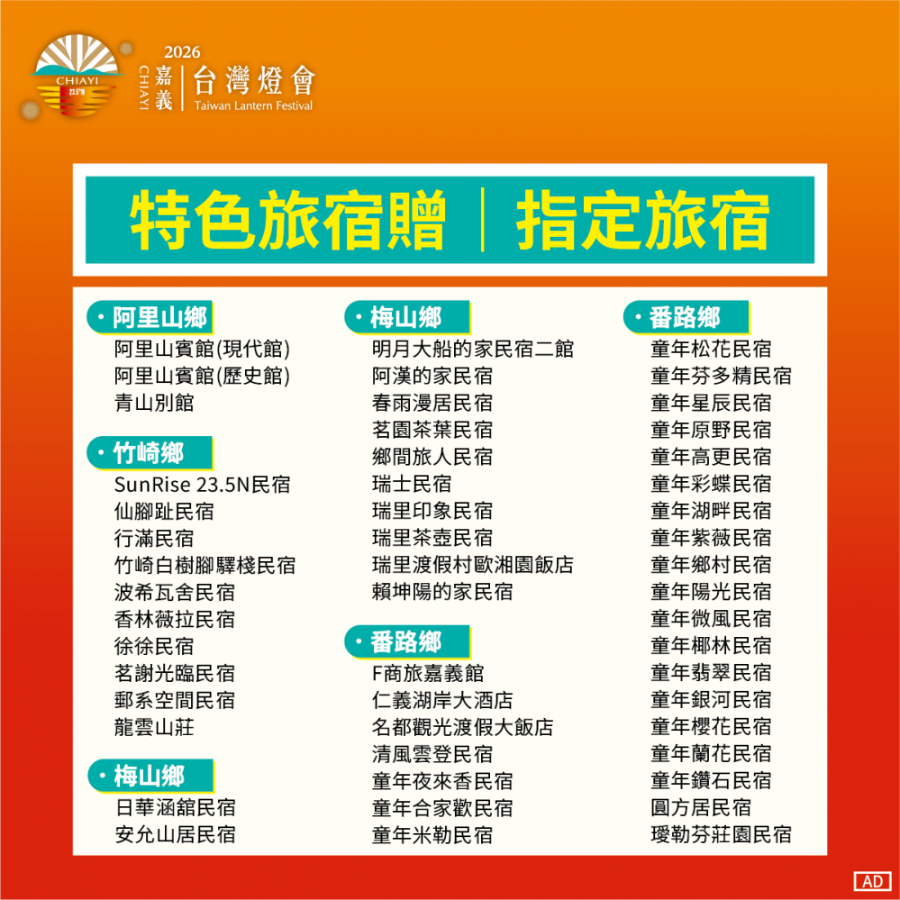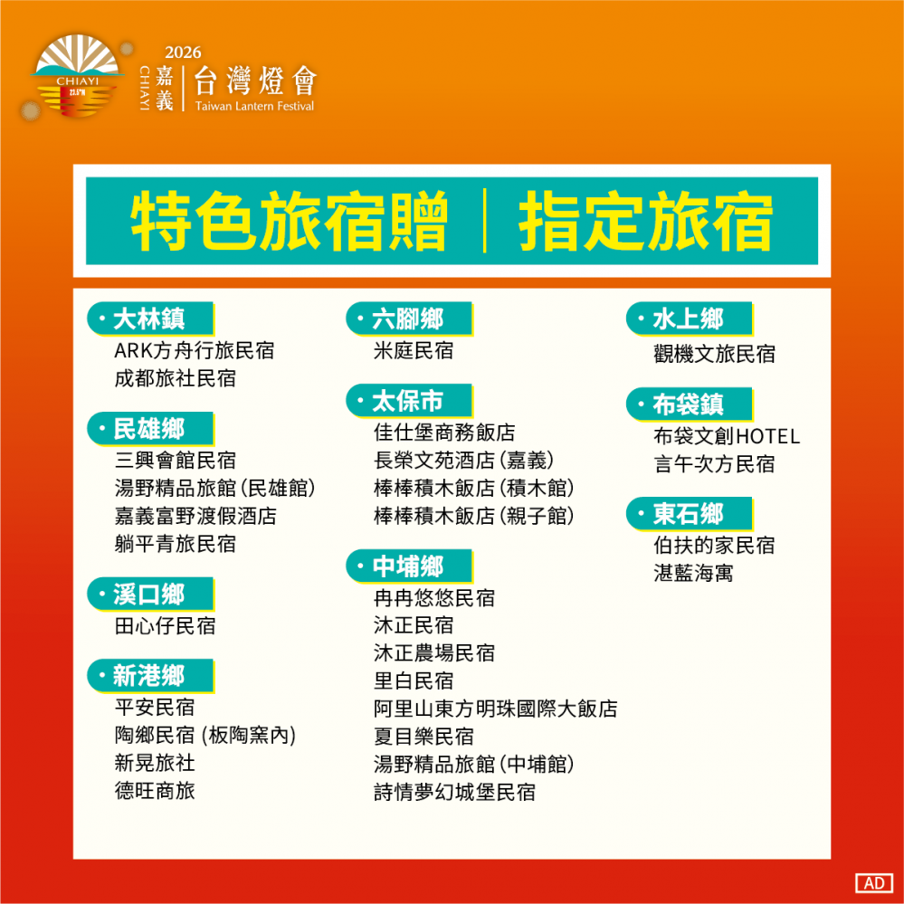 2.特色旅宿贈嘉義縣限定方案:遊客於115/3/2-14期間入住嘉義縣指定合法旅宿(目前共80家,持續募集中),即可於入住時預約兌換限量小提燈,每個LINE帳號依房數或住宿天數,合計兌換上限為3份,預約兌換期間為燈會期間(3/3-15),每日限量1800份。