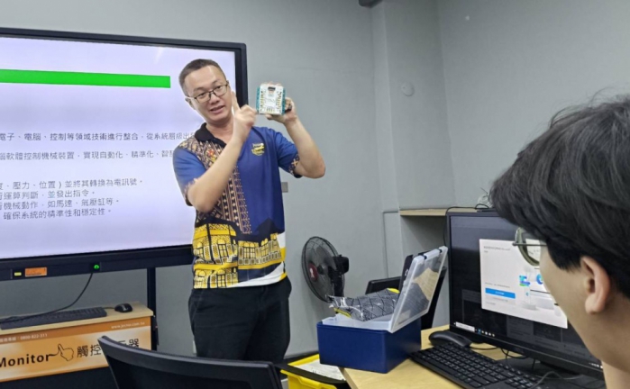 萬順華指出,社團課程以循序漸進方式設計,內容涵蓋課程導論、基本機構設計、感測器應用和程式設計等主題,讓同學完成自動搬運車組裝,並在軌道測試,在實作中理解機電控制整體概念。