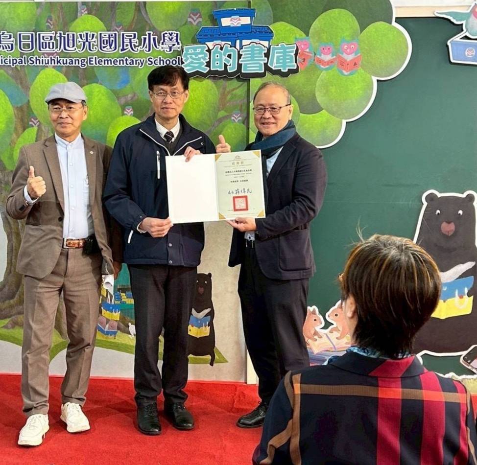 (特派員陳明/烏日報導)台中市烏日區旭光國小今(7)日舉行「愛的書庫」揭牌儀式,正式啟用台中市第33座一般圖書「愛的書庫」。台中市政府教育局長蔣偉民到場頒發感謝狀,感謝財團法人台灣閱讀文化基金會、永慶不動產七期河南市政店、永慶不動產好市多百富店、300C2區台中縣成功獅子會,以及協助書箱載運的新竹物流股份有限公司攜手促成,共同為孩子打造更豐富的閱讀環境,讓閱讀成為開啟世界的重要力量。