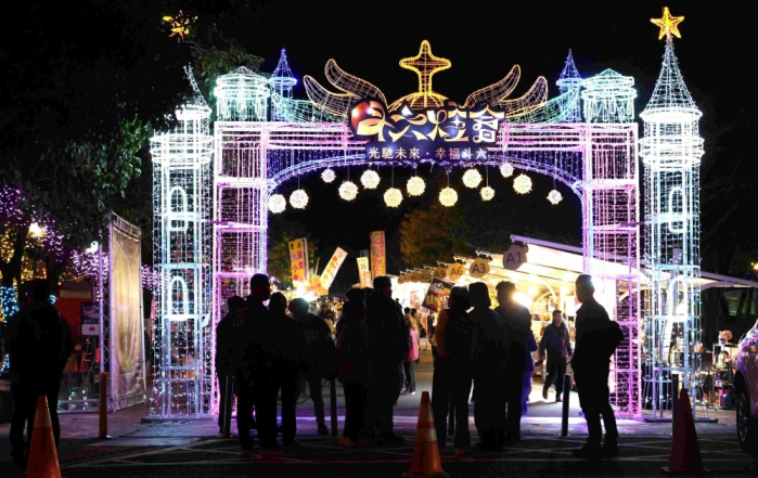 隨後主燈啟動儀式在倒數聲中登場,由張縣長、林市長等人主持啟燈,燈光裝置沿著園區逐一亮起,搭配音樂與光影變化,讓民眾彷彿走進夢幻燈光世界。