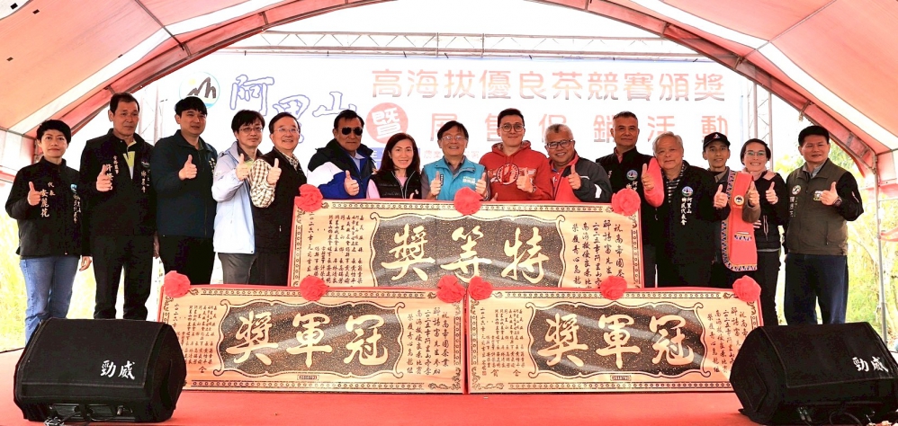 【雲嘉特派員陳信利/嘉義縣報導】阿里山鄉農會昨天(10日)在樂野服務區,舉辦「2025阿里山冬季高海拔優良茶比賽頒獎暨展售促銷活動」,本次冬茶比賽青心烏龍組,由梅山鄉高帝園茶業邱詩富奪得特等獎,萱組特等獎由台中市坤芳茗茶行陳逸謙榮獲。