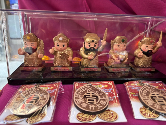 嘉義城隍廟為迎接新春賀歲特別推出五路財神公仔一組2000元;整組(含東、南、西、北與中路財神5個公仔)再免費贈送一個虎爺公仔。此五路財神公仔設計理念乃融合傳統信仰與現代公仔設計語彙,傳遞喜氣、富貴與祝福的寓意。五尊財神分別象徵東、南、西、北與中路之財運,造型以圓潤親切的比例結合紅金配色,展現祥瑞與高貴氣質(金色隱藏版象徵「五路歸一、財運聚源」,以耀眼金屬質感打造,寓意萬財歸庫、福運無窮。)。