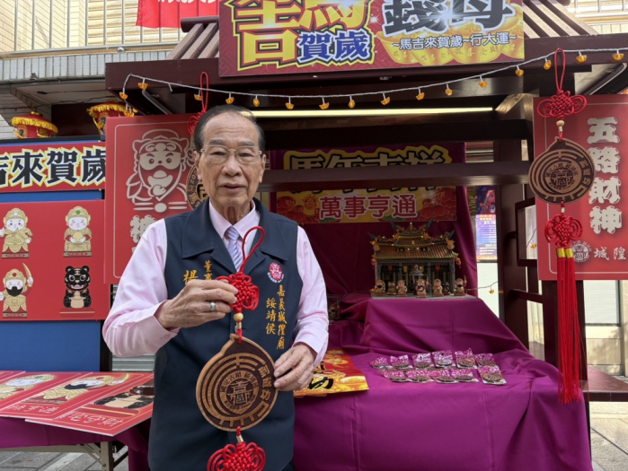 城隍廟第14屆新任董事長楊嘉南歡迎大家新春來走春,開運祈福、迎財神、發大財。今年限量創意吉祥好物(馬)年錢母正面以金牌獎章概念做為設計主軸,中間雷雕「吉」字結合馬年圖象徵「馬吉」馬年吉祥;又有台語諧音(麻吉)代表著「好馬年、好麻吉」,錢母背面則以變體字符號強調「馬到成功」,整體主題涵義為「馬吉來賀歲~馬到必成功」信眾隨身攜帶,將聚集一整年的金玉滿堂,讓您事業旺、財運旺。