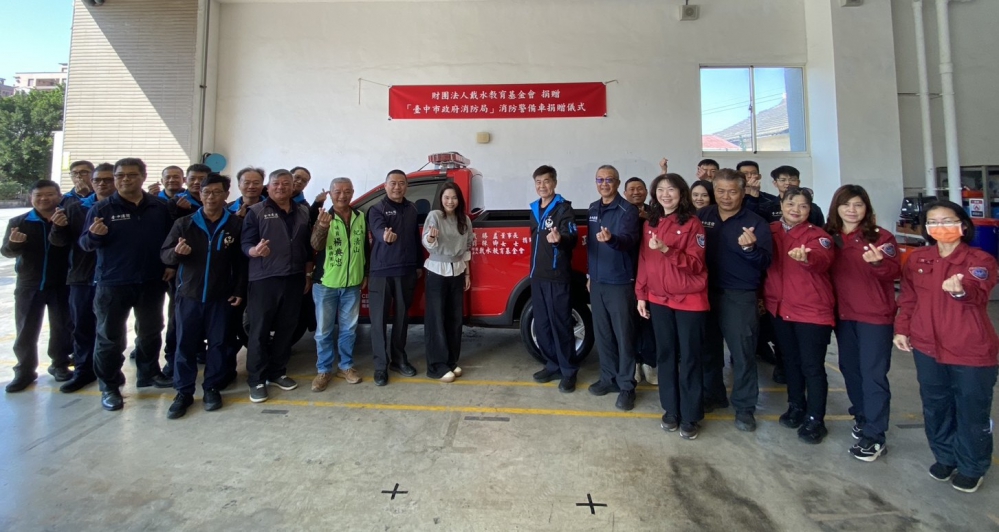 (特派員陳明/臺中報導)財團法人戴水教育基金會秉持「推動公益、關懷社會」的宗旨,今(20)日上午於台中市政府消防局清水消防分隊舉行捐贈儀式,捐贈消防警備車1輛,提升第四救災救護大隊清水分隊救災戰力,由副大隊長許修豪代表受贈並回贈感謝狀,感謝基金會及董事長戴勝益對消防工作的熱心支持,展現財團法人回饋鄉里的具體行動力。