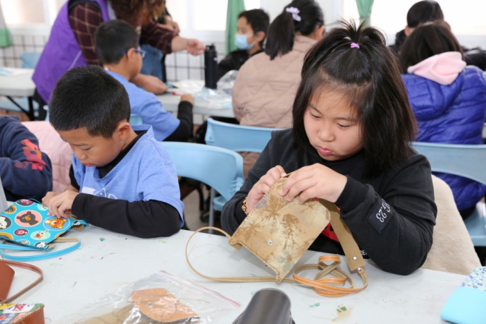 本場次活動由台灣冷凍空調展望關懷協會為主辦單位,由救國團嘉義團委會為承辦單位,結合救國團東石鄉團委會社區據點資源,特別邀請手作講師沈康雅紡老師,帶領網寮國小1至6年級共31名學生,運用拼布、皮革等素材,製作兼具實用與美感的文創手作「拼布皮革斜背手機袋」。孩子們從設計、裁剪到縫製,全程親手完成,專注的神情與成品完成時的笑容,成為活動現場最動人的畫面。