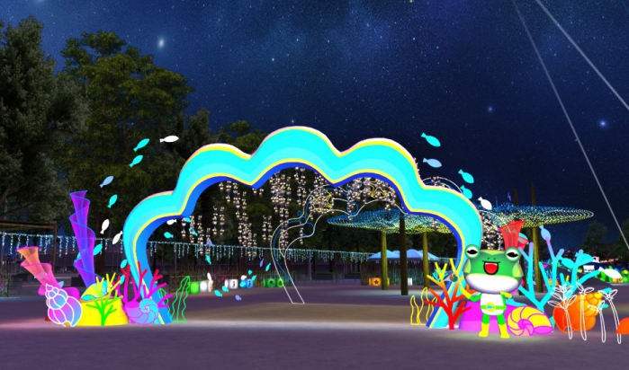 「等鱟站」以嘉義縣濱海環境教育館為藍圖,結合鱟造型的設計,周邊以豐富的海洋環境燈飾襯托環境教育館,象徵守護美麗海岸線及生態復育的期待。(燈區示意圖/嘉義縣政府提供)