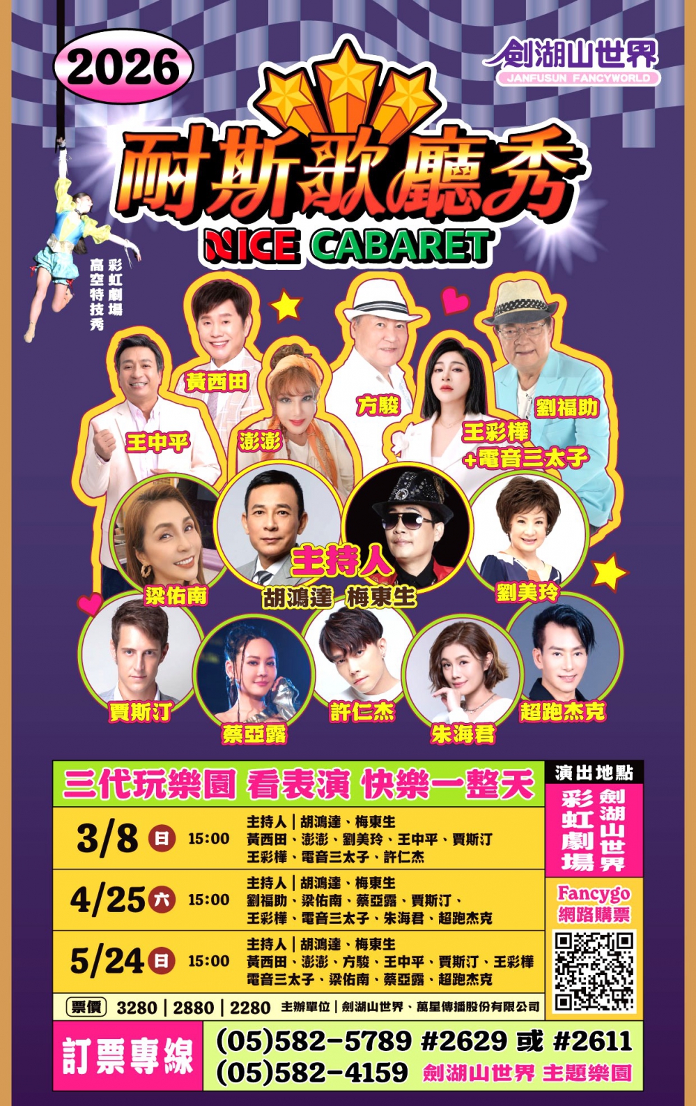 《耐斯歌廳秀》演出日期分別為3月8日(周日)、4月25日(周六)及5月24日(周日),都於下午3點開演,地點位於劍湖山世界彩虹劇場。票價依座位區分為3,280元、2,880元及2,280元,門票於劍湖山世界官網熱賣中。