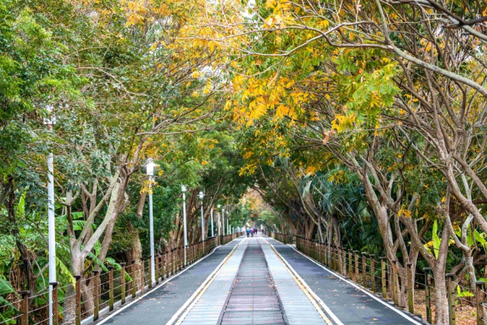 不僅炮仗花牆吸睛,有「南部最美自行車道」之稱的嘉油鐵馬道紅瓦厝站一帶無患子葉片也逐漸轉為金黃,遠望過去彷彿一條閃耀金光的林蔭隧道。