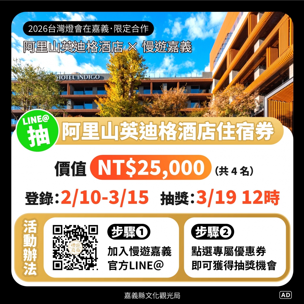 【雲嘉特派員陳信利/嘉義縣報導】2026台灣燈會即將於嘉義盛大登場,為迎接這場全台矚目的年度觀光盛事,阿里山英迪格酒店攜手嘉義縣政府「慢遊嘉義」品牌,推出「2026台灣燈會在嘉義限定合作|阿里山英迪格酒店×慢遊嘉義」專屬活動。