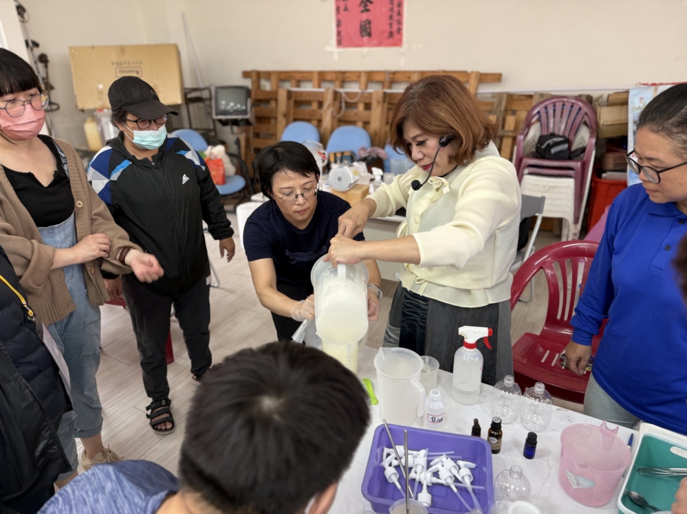 活動採用嘉大嘉好生態園中培育的香茅作為精油基底,結合在地海岸白千層等天然植物素材,帶領居民親手製作手工香皂與天然洗髮精。在歲末年終之際,參與者一邊動手實作、一邊交流分享,將祝福、健康與對土地的情感融入作品中,為新年增添一份來自自然的安心與心意。