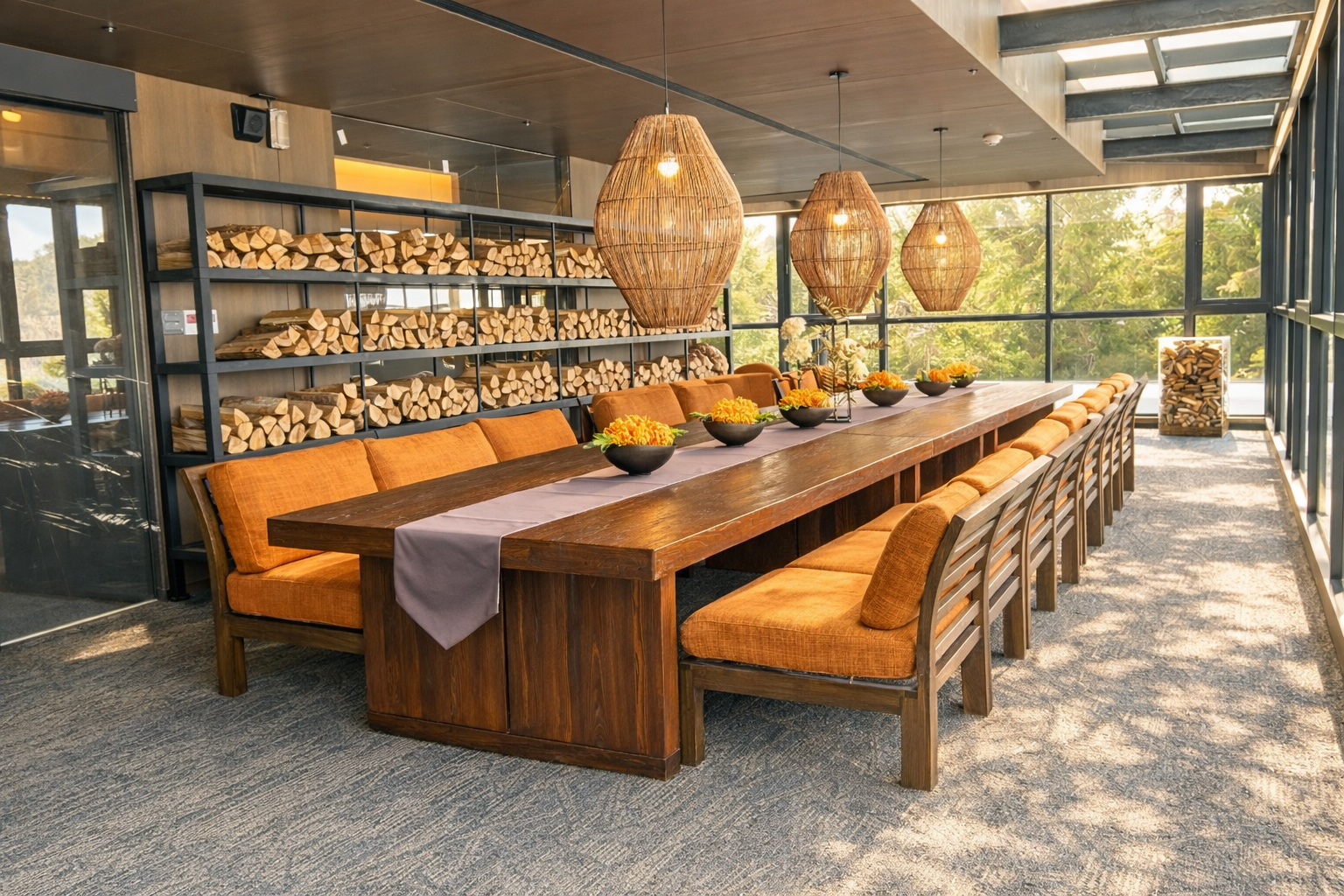 特別值得一提的是,交誼廳的沙發設計揉和木質與溫柔暖色系的愛馬仕橘呈現經典時尚的風格,完美的住進清晨和日落,隨著夕陽金黃色光芒,山色逐漸沉靜,靜享山色變化萬千又不喧囂的悠閒。