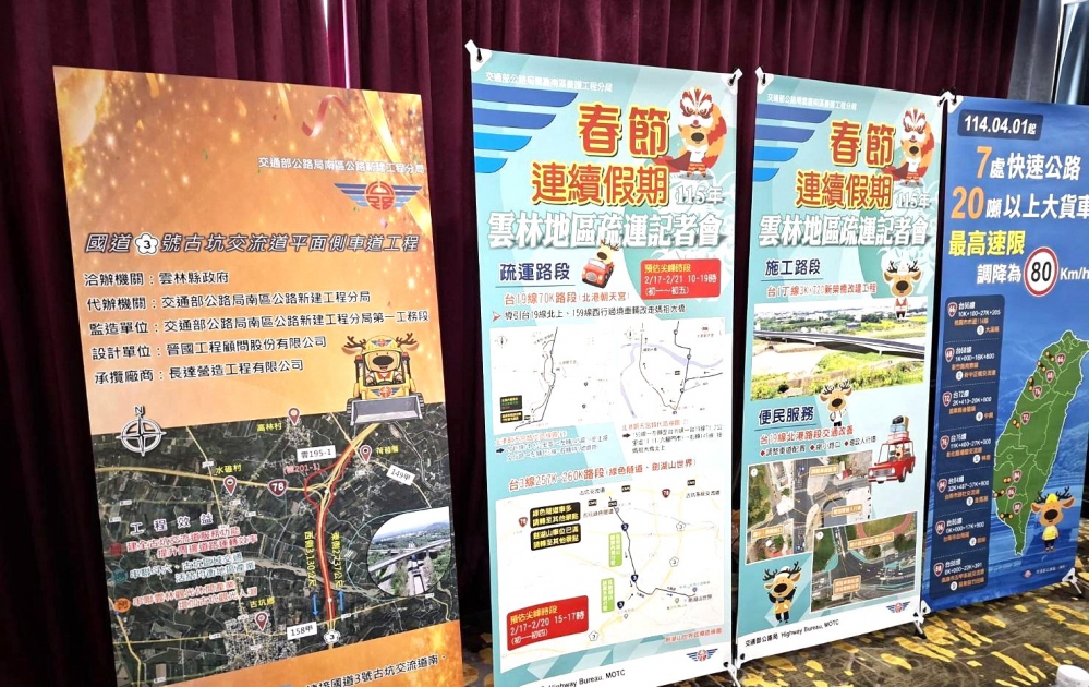 公路局南區公路新建工程分局聯合雲嘉南區養護工程分局、嘉義區監理所、雲林監理站、雲林縣政府交工局及縣警局交通隊等單位,今天(6日)在斗六市三好國際酒店,共同舉辦「115年雲林地區春節疏運記者會」,加強春節疏運措施宣導。
