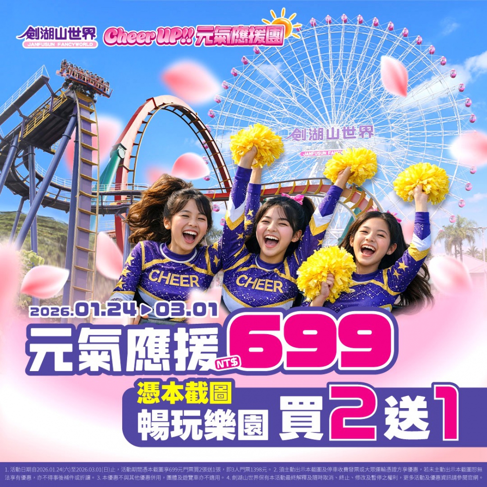 ◆買二送一:憑指定截圖購買699元優惠票享買二送一。