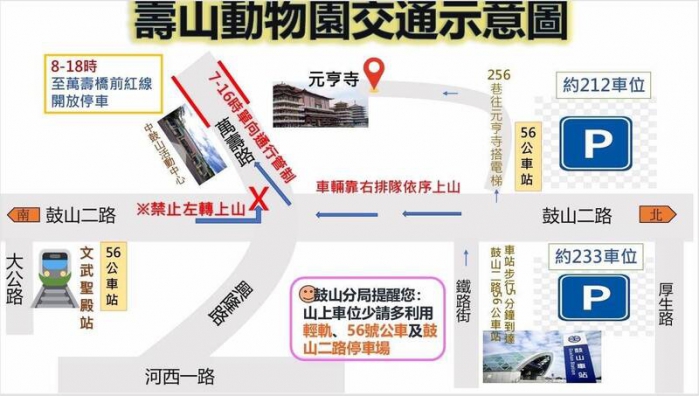 鼓山分局指出,「壽山風景區」交管時間為8時至18時,視車流量機動實施萬壽路往動物園方向單行管制,停車場滿位時於興隆路口截流車輛上山,並彈性管制鼓山二路左轉興隆路。建議民眾搭乘輕軌及公車轉乘上山。