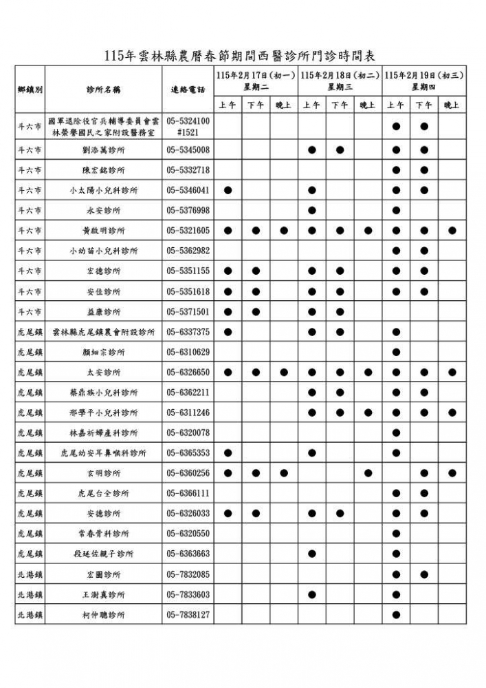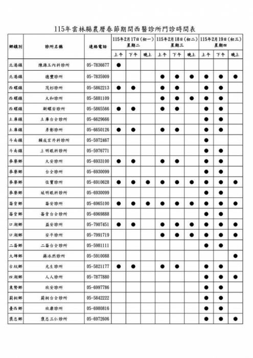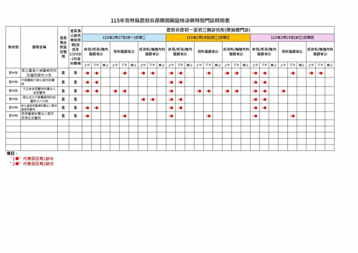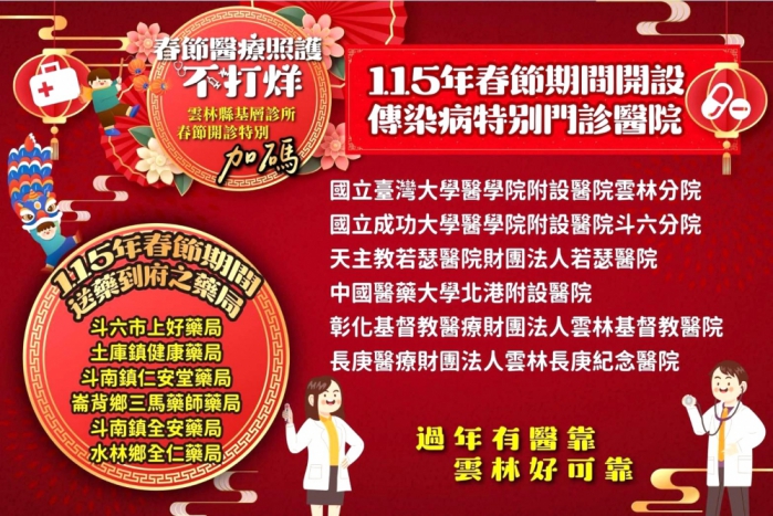此外,在急重症醫療方面,春節連假期間雲林縣6家急救責任醫院,將全面維持24小時急診服務,衛生局每日即時掌握各院急診候診及待床情形,與責任醫院密切合作、即時應變,確保急重症患者獲得妥適照護,並於農曆初一至初三加開傳染病特別門診。