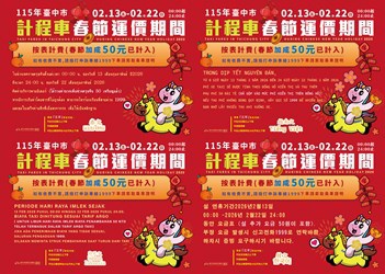 交通局表示,因應國際旅客增加,為讓乘客清楚了解計程車春節收費規定,避免語言障礙或誤會,近日已在台中火車站等主要交通樞紐加強宣導,還特別印製中、英、日三國語言的春節費率貼紙,向不同國籍旅客說明收費規定,由計程車公(工)會及各大車隊發放給駕駛,張貼於車內明顯位置。同時,今年持續準備韓文、泰文、印尼文、越南文等4國語言宣傳單,協助業者擴大宣導,展現台中市友善、貼心的城市形象。