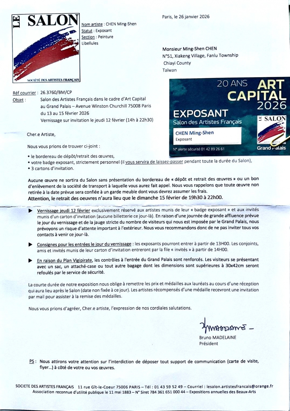 在法國皇宮展出時,大會特別於圖上方標示法語「台灣」,讓陳明順深受感動與光榮,除增添台灣藝術家能見度與傑出畫作受到青睞,並與全球美術界同為追求世界真善美,與東方易經追求天人合一理念一致。