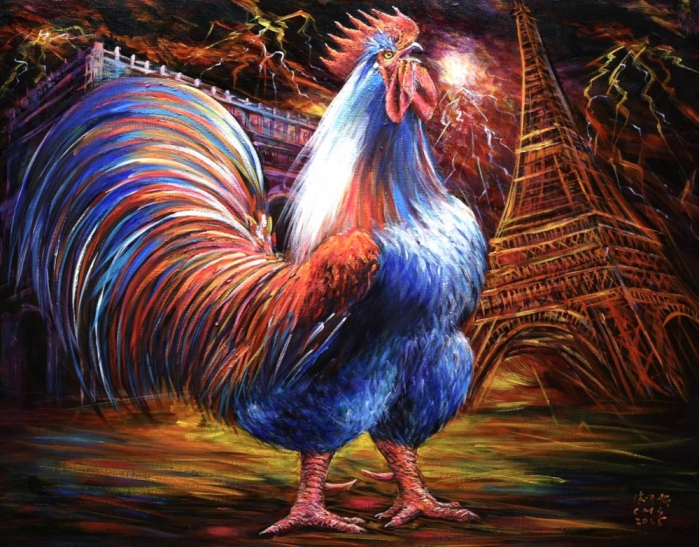 本次獨立沙龍展覽,陳明順以「雞」成家有德,融合易經乾坤陰陽,再融入現代藝術之父法國塞尚的形體不存在藝術理念,以藍白紅色系表現自由、平等、博愛的法國國旗色彩作品參展。