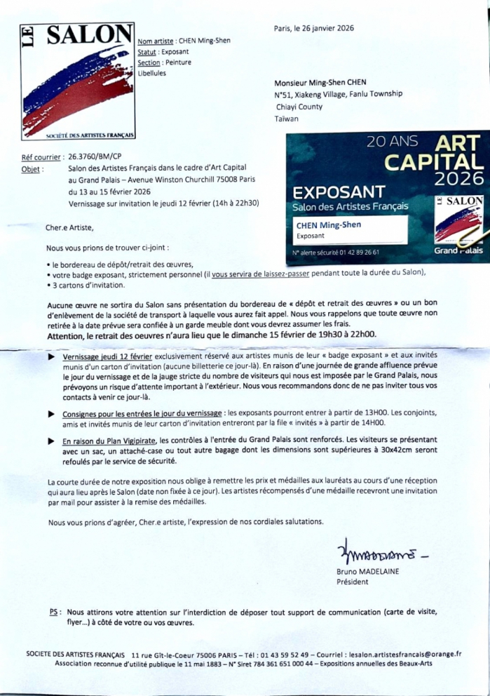 來自嘉義縣番路鄉的陳明順表示,2026全球法國皇宮大展由since1667法國藝術家春季沙龍協會、since1884法國藝術家獨立沙龍協會等,邀集來自全球約70國家共1000名油畫,雕塑,素描,攝影等入選作品參展。