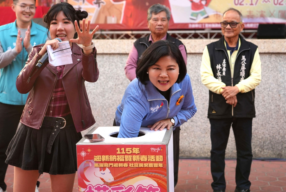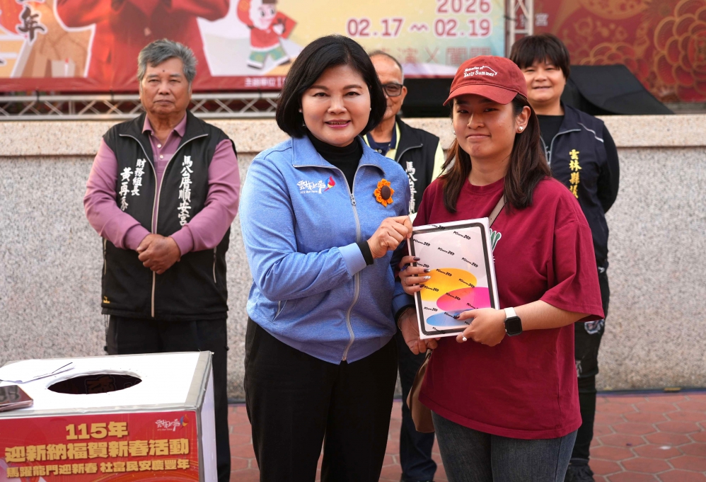 她並代表主辦單位抽出活動頭獎「平板電腦」幸運得主,在鄉親熱情歡呼聲中加碼6個紅包及2台平板電腦,將現場氣氛推向最高潮,廟埕洋溢濃濃年味與歡樂笑聲。