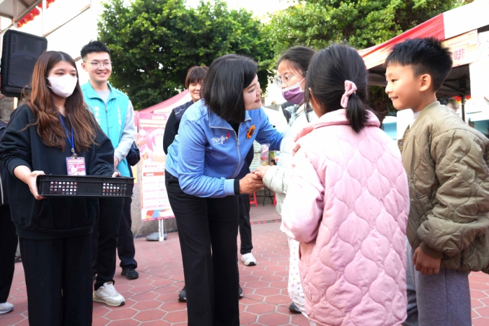 隨後,張縣長回到娘家土庫鎮馬光厝,由縣議員王鈺齊等人陪同先至順安宮參拜祈福,再前往「迎新納福賀新春」活動會場,發放象徵團圓甜蜜的糖葫蘆給小朋友,祝福大家新春快樂。