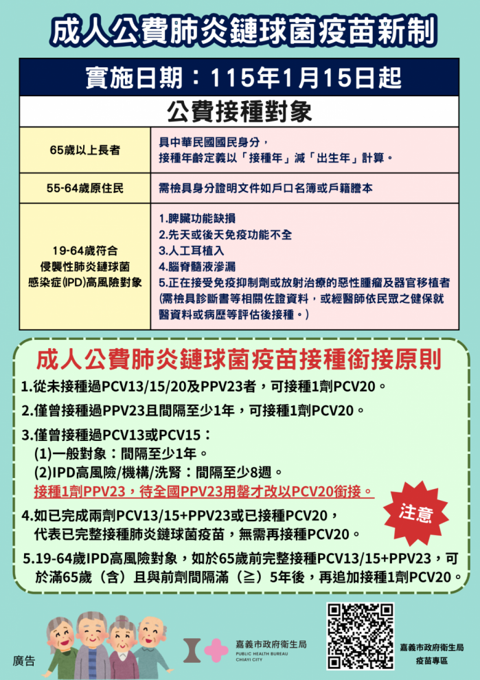 此外,市府衛生局將於2月24日、25日及26日3天下午4-6時,在文化公園(民族路側) 設立肺炎鏈球菌、流感及新冠疫苗接種站。