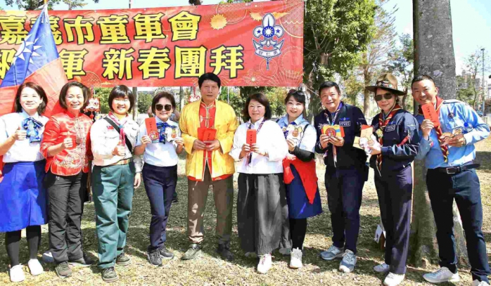 【雲嘉特派員陳信利/嘉義市報導】嘉義市長黃敏惠今天(22日)帶領市府團隊與校園長出席財團法人幼獅童軍教育事務基金會,於嘉義市蘭潭露營區舉辦各級童軍團新春團拜活動,與各童軍團彼此互道恭喜,並於現場發放粉紅超馬小紅包,祝福大家馬年行大運、馬到成功、馬力全開!