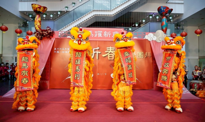 在「敲好運(超好運)」的鑼聲中,黃副市長帶領市府團隊象徵好運開啟,帶領台中朝向宜居、宜業、宜遊的國際化幸福城市邁進。今日現場上千位各界人士及同仁共襄盛舉,中市府公務人員協會、現職暨退休公教合唱團以及活潑可愛的小獅團皆帶來精彩演出,洋溢濃厚年節氛圍。