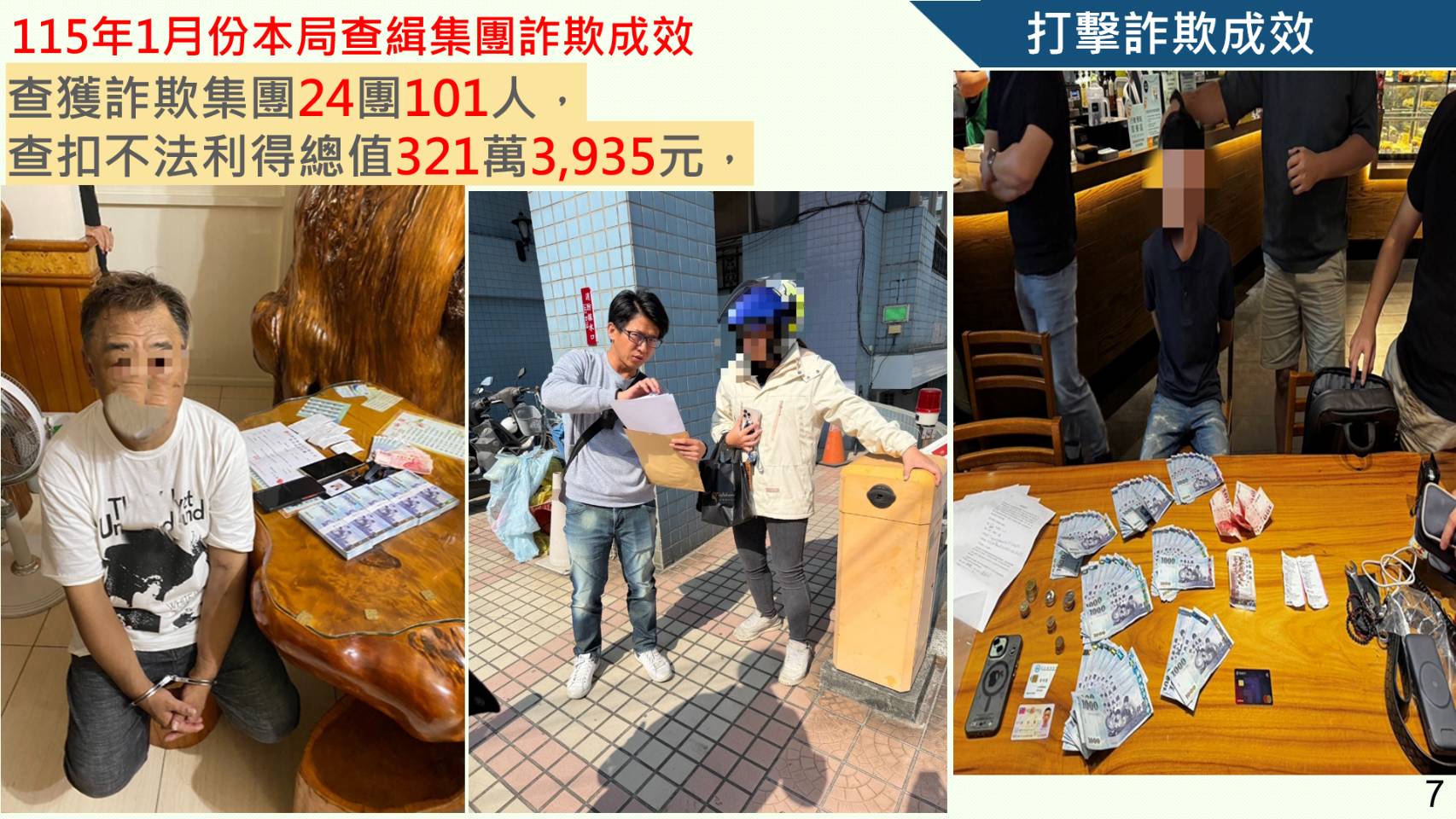 在打擊詐欺犯罪部分115年1月份查緝集團詐欺成效共查獲詐欺集24團101人,查扣不法利得總值321萬3,935元。攔阻詐欺件數部分,統計115年1月份則有22件、1,543萬8,829元,較 114年同期增加10件、1,040萬2,129元。