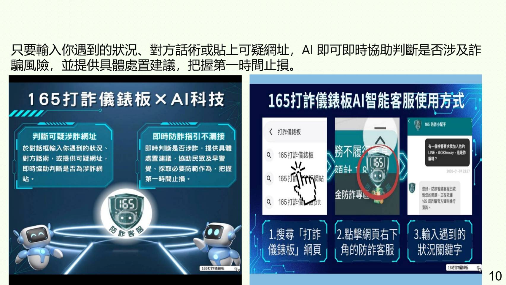 警察局長古瑞麟指出,為提升民眾防詐能力,內政部警政署「165打詐儀錶板」再度升級,近期已正式導入 AI智能防詐客服,只要輸入你遇到的狀況、對方話術或貼上可疑網址,AI 即可即時協助判斷是否涉及詐騙風險,並提供具體處置建議,特別呼籲民眾多加利用,如遇可疑狀況、可疑對話或是可疑網址,均可求助於AI協助辨識,成功阻絕不肖詐騙犯嫌持續欺騙大眾。