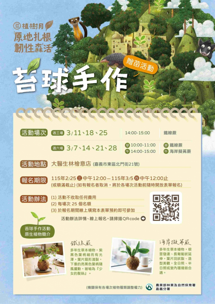 嘉義分署首場贈苗活動將配合今年臺灣燈會,於3月4日下午3時在燈會特色市集辦理公益贈苗活動,特別準備限定版莿竹可分解苗盆,樹種為鐵線蕨、黃楊及鵝掌藤,適合居家及辦公空間綠化,民眾準備2張115年1-3月發票即可兌換1株,數量有限兌完為止。另今年全新推出苔球手作活動11場次,由講師帶領民眾進行苔球療癒體驗,讓原生植物鐵線蕨及海岸擬茀蕨能以更貼近生活的方式融入日常空間,活動採線上預約免費參與,時間為3月每週六上午10點、下午2點與3月11、18、25日(三)下午2點各1場次,、登記時間自2月25日中午12時起至3月5日中午12時止(額滿將提前關閉)。