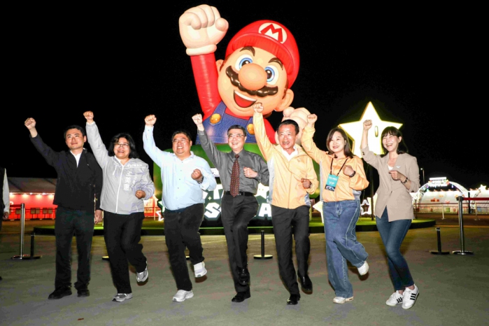 開幕典禮結束後,卓院長偕翁縣長等人一同前往超級瑪利歐·星燦嘉年華燈區視察,關心展區動線與人潮疏導措施,並一同在GET THE STAR!超級瑪利歐主題燈區合照留影。(圖/縣政府提供)