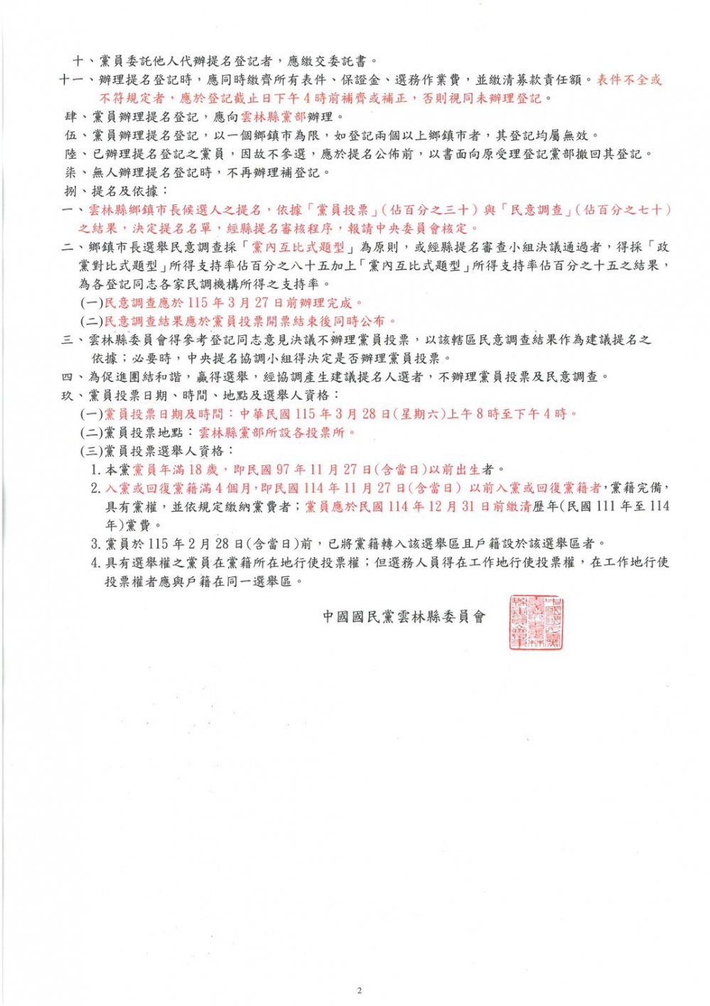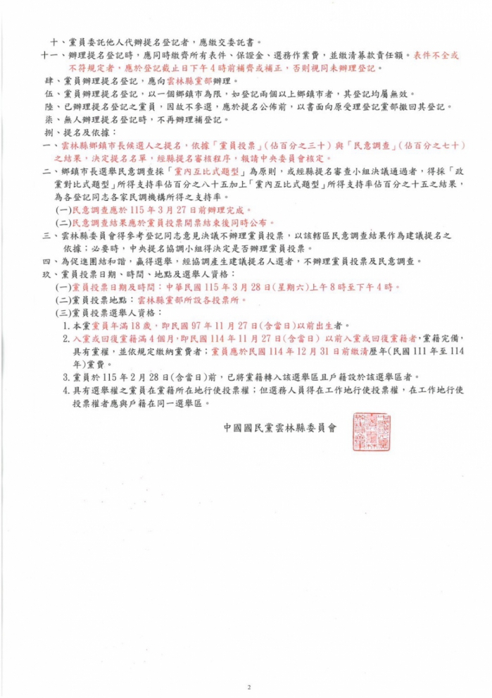 其中民意調查作業將於3月27日前辦理,28日(周六)舉行黨員投票,再核計參與爭取提名者黨員投票及民意調查結果,經縣黨部提名審核程序後,報請黨中央核定公告提名。