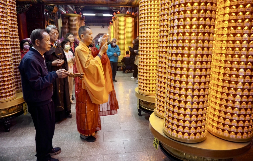 接著,由彰化朝天堂普銓法師開懺,偕同蕭董事長及董事張俊鎮到斗燈、太歲殿、光明燈、文昌燈殿灑淨及點燈;誦經團則持續誦經祈福,莊嚴肅穆。